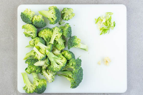 Den Brokkoli in mundgerechte Röschen schneiden, nach Wunsch den Strunk in kleine Würfel schneiden und mitverwenden. Die Lauchzwiebeln in feine Röllchen schneiden. Den Knoblauch schälen und sehr fein würfeln oder durch eine Knoblauchpresse drücken.