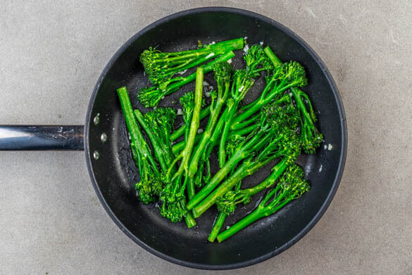 Die Brokkolini in einer großen Pfanne mit 1EL Olivenöl bei mittlerer Hitze ca. 1Min. anbraten. Etwas Wasser in die Pfanne geben und die Brokkolini 3–5Min. abgedeckt garen. Dann den Deckel entfernen und den Knoblauch sowie je 1 kräftige Prise Salz und Pfeffer unterrühren und die Brokkolini nach Geschmack noch 1Min. oder etwas länger braten.
