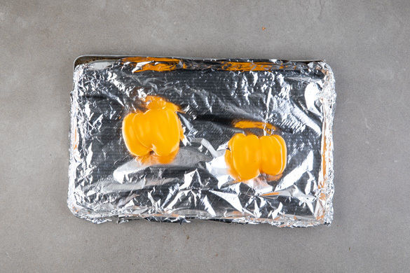 Ein Backblech mit Alufolie auslegen und die Paprikahälften mit der Schnittfläche nach unten 10–15Min. im Ofen rösten, bis die Haut sich leicht wölbt und dunkle Stellen bekommt.