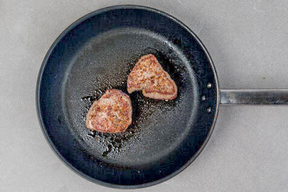 Das Fleisch trocken tupfen und in einer großen Pfanne mit 2EL Olivenöl bei starker Hitze auf jeder Seite 2–3Min. braten, abhängig davon, ob es medium oder eher durchgebraten sein soll. Aus der Pfanne nehmen und bis zum Servieren auf einem Teller abgedeckt ruhen lassen. Die Pfanne wird weiterverwendet.