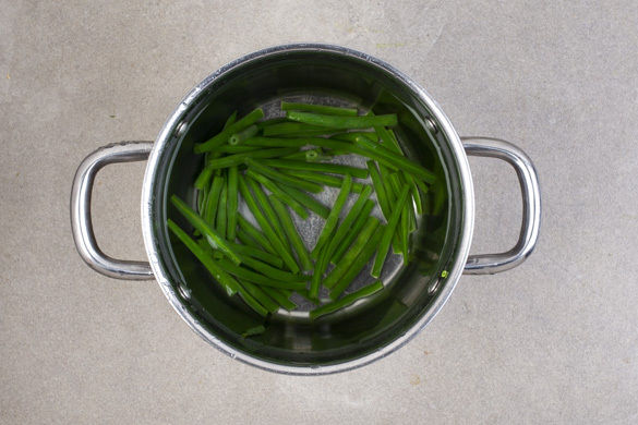 Die Enden der Bohnen abschneiden, dann die Bohnen quer halbieren und im kochenden Wasser in ca. 10Min. gar kochen. Die Bohnen in ein Sieb abgießen, mit kaltem Wasser abschrecken und abtropfen lassen.