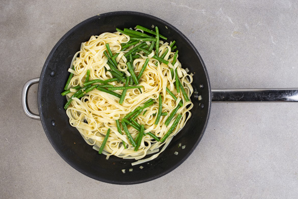 Die Pasta in das kochende Wasser geben und in 7–9Min. bissfest kochen. Währenddessen die Estragonblätter von den Stängeln zupfen und grob schneiden. Die Pasta in ein Sieb abgießen und abtropfen lassen.