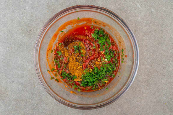 Die Petersilie grob hacken. Den Knoblauch schälen und fein würfeln. Die ½ des Tomatenmarks, die passierten Tomaten, 100ml Wasser, 1EL Olivenöl, die Petersilie, den Knoblauch, die Gewürzmischung, ½TL Zucker und je 1 Prise Salz und Pfeffer zu einer Sauce verrühren.