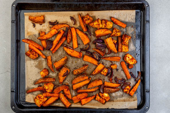 Die Süßkartoffeln in Spalten schneiden, dann die Spalten halbieren. Die Karotte quer halbieren, dann längs vierteln. Die Zwiebel schälen und halbieren und eine Hälfte in ca. 1cm breite Spalten schneiden. Das Gemüse und den Tofu mit der Marinade vermengen und auf zwei mit Backpapier ausgelegten Backblechen verteilen. Den ungeschälten Knoblauch dazulegen.