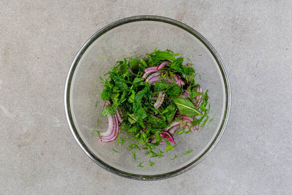 Inzwischen ½EL Honig mit ½EL Essig und 1 Prise Salz verrühren. Die übrige Zwiebelhälfte in feine Streifen schneiden und mit dem Dressing vermengen. Die Minzeblätter von den Stängeln zupfen und mit dem Dill grob schneiden. Die Kräuter mit den Zwiebeln und dem Dressing vermengen.