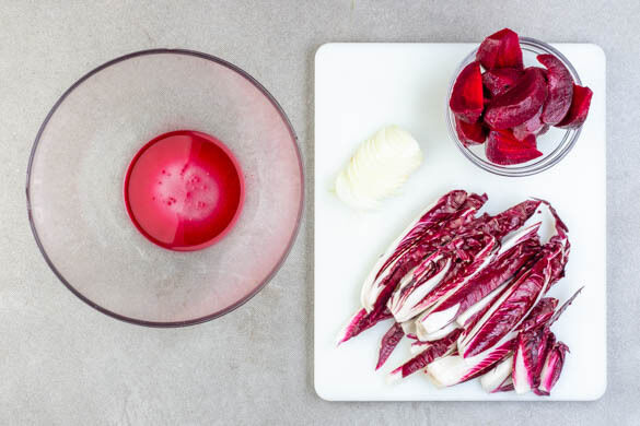 Den Chicorée in einzelne Blätter zerteilen. Die ½ der Zwiebel schälen und in feine Streifen schneiden. Die ½ der Rote Bete abgießen, dabei ½EL Saft auffangen, dann in Spalten schneiden. Die restliche Rote Bete und die übrige Zwiebelhälfte werden für dieses Rezept nicht benötigt.