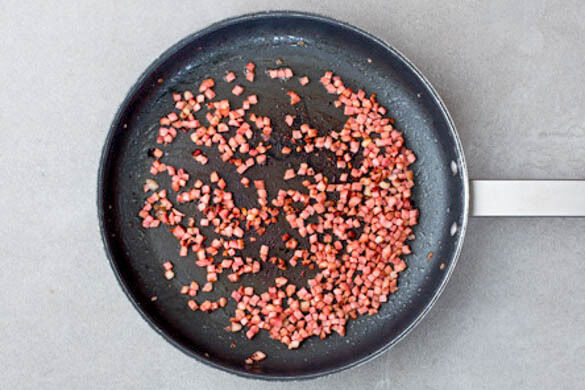 Den Speck in einer mittelgroßen Pfanne bei mittlerer Hitze in 4–5Min. langsam braten, bis er schön kross ist. Nebenher die Paprika vierteln, entkernen und in feine Streifen schneiden.