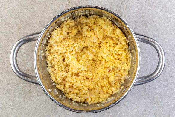 In einem kleinen Topf 300ml leicht gesalzenes Wasser zum Kochen bringen. Die Schalotte schälen, halbieren und eine Hälfte fein würfeln. Den Bulgur und die Schalottenwürfel in das kochende Wasser rühren und abgedeckt bei niedriger Hitze 5–7Min. sanft köcheln lassen, bis das Wasser aufgesaugt und der Bulgur gar ist. Noch ca. 5Min. ohne Hitzezufuhr ziehen lassen.