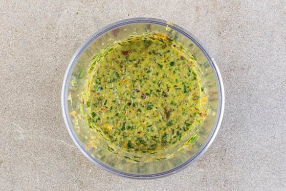 Die restliche Schalotte halbieren und eine Hälfte in einem hohen Gefäß mit den Kräutern, dem Knoblauch, den Kapern, dem Orangensaft, der Orangenschale, 2EL Olivenöl, 1EL Essig, ½TL Honig, 1 Prise Chiliflocken und 1 Prise Pfeffer zu einer stückigen Sauce pürieren. Die übrige Schalotte in feine Streifen schneiden.