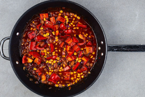 Das Tomatenmark unterrühren, dann mit 400ml Wasser ablöschen und die Bohnen samt Flüssigkeit hinzugeben. Das Chili ca. 10Min. bei mittlerer Hitze köcheln lassen, dabei gelegentlich umrühren. 2EL Mais für die Garnitur aufbewahren. Den restlichen Mais in das Chili rühren, mit Salat und Pfeffer abschmecken.