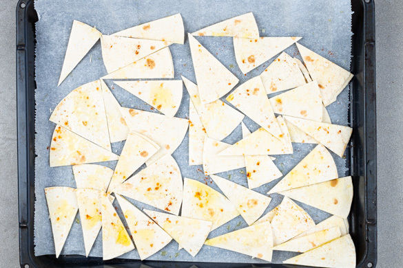 Die Tortillas übereinander legen und in lange, dünne Dreiecke schneiden. Mit 2TL Olivenöl, 1 kräftigen Prise Gewürzmischung sowie Salz vermengen, auf einem mit Backpapier ausgelegten Backblech verteilen und in 5–8Min. im Ofen knusprig backen.