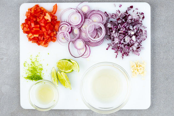 Die Tomaten mit den restlichen Zwiebelwürfeln, 2EL Olivenöl sowie je 1 kräftigen Prise Zucker, Salz und Pfeffer verrühren. Die Guacamole nach Geschmack mit 1 kräftigen Prise Gewürzmischung sowie Salz und Pfeffer verfeinern.