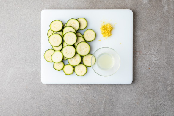 Währenddessen die Zucchini in ca. 0,5cm dünne Scheiben schneiden und mit 1 kräftigen Prise Salz vermengen. Die Zitronenschale abreiben, dann die Zitrone halbieren und auspressen.