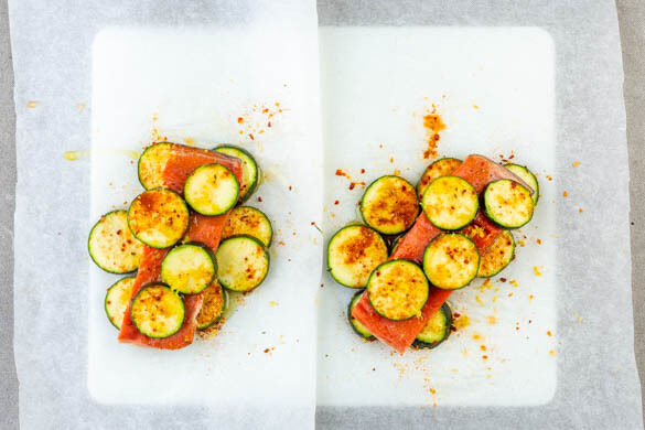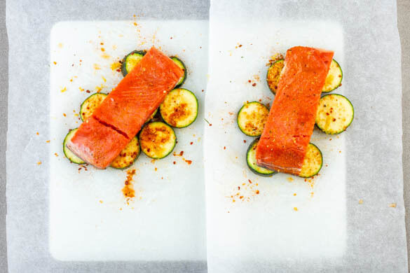 Den Lachs trocken tupfen und evtl. vorhandene Gräten entfernen. Für die Päckchen sechs ca. 30cm lange Stücke Backpapier zuschneiden und die ½ der Zucchinischeiben mittig darauf verteilen. Mit etwas Zitronenschale und 1 Prise Gewürzmischung bestreuen. Je 1 Lachsstück darauflegen und erneut mit 1 Prise Gewürzmischung sowie 1–2TL Zitronensaft würzen.