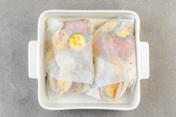 Die Backpapierstücke dicht verschließen und die Päckchen in einer Auflaufform 10–12Min. im Ofen garen. Dann die Päckchen vorsichtig öffnen und noch 5–8Min. offen backen. Tipp: Je nach Dicke der Lachsstücke kann die Garzeit variieren.