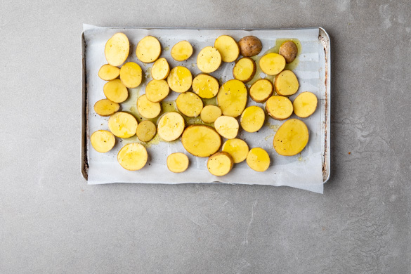 Den Backofen auf 250°C (230°C Umluft) vorheizen. Die Kartoffeln samt Schale in ca. 0,5cm dicke Scheiben schneiden und mit 3EL Olivenöl sowie je 1 kräftigen Prise Salz und Pfeffer vermengen. Auf einem mit Backpapier ausgelegten Backblech verteilen und 20–25Min. im Ofen rösten, bis die Kartoffeln goldbraun und gar sind.