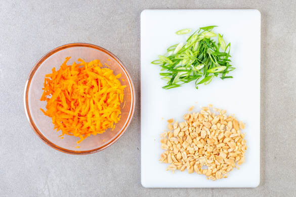 Den Backofen auf 200°C (180°C Umluft) vorheizen. Die Karotten ggf. schälen, auf der groben Seite einer Küchenreibe raspeln und mit 2TL Pflanzenöl, 2TL hellem Essig und je 1 kräftigen Prise Salz und Zucker vermengen. Die Lauchzwiebeln schräg in feine Ringe schneiden. Die Erdnüsse grob hacken.
