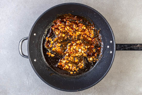 Die Knoblauch-Ingwer-Paste in derselben Pfanne mit 2EL Pflanzenöl bei mittlerer Hitze ca. 1Min. anbraten. Mit 3EL Wasser und der ½ der Fischsauce ablöschen, dann die Pfanne vom Herd nehmen. Die Hoisinsauce und ca. ⅔ der gehackten Erdnüsse unterrühren und die Sauce über die Steaks geben.
