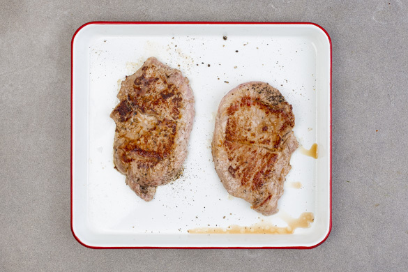 Das Fleisch trocken tupfen und in einer mittelgroßen Pfanne mit 1EL Pflanzenöl bei starker Hitze auf jeder Seite ca. 1Min. scharf anbraten. Die Steaks in eine Auflaufform geben und mit Salz und Pfeffer würzen.