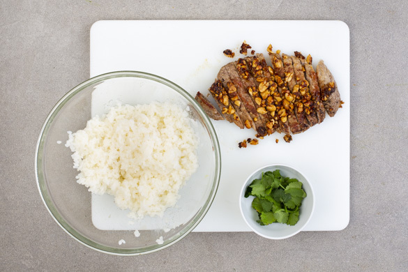 Der Express-Vollkornreis wird mit einer Spur Essig und Zucker fein abgeschmeckt und mit saftigen Schweinesteakstreifen, Karottenraspeln, Lauchzwiebeln und einer süchtig machenden Sauce mit Ingwer und Erdnüssen garniert. Der Vorteil des Servierens in einer Bowl: Du kannst das Gericht ganz klassisch mit Stäbchen essen!