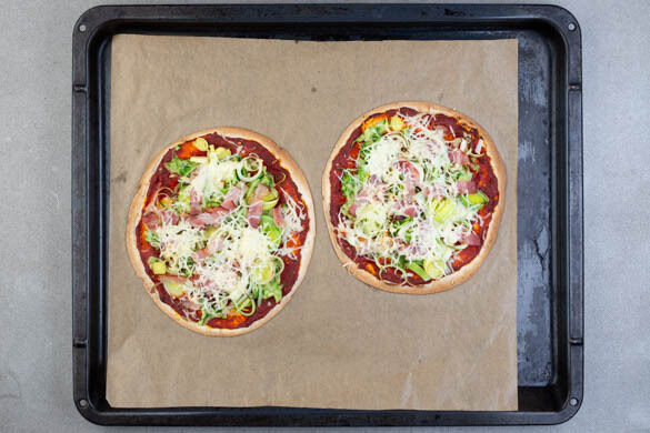 Die Pizzen im Ofen 4–6Min. backen, bis der Käse geschmolzen ist und die Tortillas leicht bräunen. Die übrigen Tortillas auf die gleiche Weise mit den restlichen Topping-Zutaten belegen und backen.