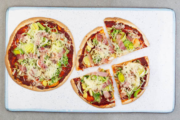 Heute gibt es etwas ziemlich Geniales: Pizzen aus Tortillas! Hier muss niemand lange Teig kneten, denn die kreisrunden Fladen eignen sich perfekt für diesen schnellen Küchentrick und werden ratzfatz zu aromatischen Pizzen umfunktioniert. Perfekt für alle, die zwar eigentlich gerne kochen, aber manchmal dann doch ein bisschen träge sind – so wie wir. Mit Bacon, Zucchini und Lauch belegt sind sie auch geschmacklich der Renner!