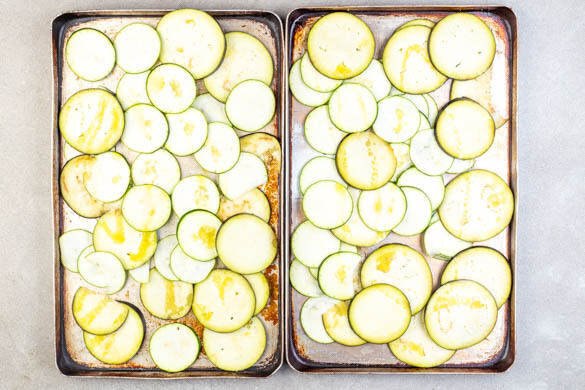 Den Backofen mit Grillfunktion oder Ober-/Unterhitze auf 250°C vorheizen. Die Zucchini und die Auberginen in dünne Scheiben schneiden, mit 6EL Olivenöl sowie je 1TL Salz und Pfeffer vermengen, gleichmäßig auf zwei Backblechen verteilen und 8–15Min. rösten, bis es weich und leicht gebräunt ist. Die Position der Bleche nach der Hälfte der Backzeit tauschen. Ggf. portionsweise vorgehen.