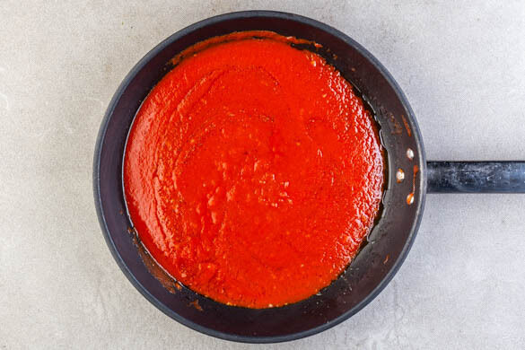 Den Knoblauch schälen und sehr fein würfeln oder durch eine Knoblauchpresse drücken. Den Knoblauch in einer großen Pfanne mit 3EL Olivenöl bei mittlerer Hitze in ca. 30Sek. duftend anrösten. Die passierten Tomaten, je 1TL Salz und Pfeffer sowie ½TL Zucker zugeben und bei niedriger Hitze bis Schritt 4 köcheln lassen.