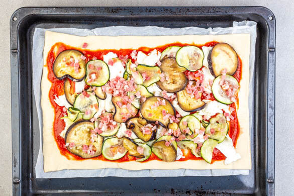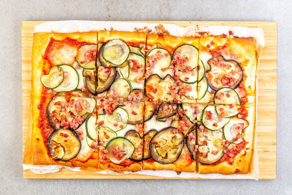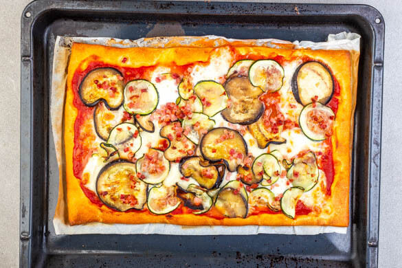Die Teige mit dem Papier nach unten auf je 1 Backblech ausrollen und gleichmäßig mit der Tomatensauce bestreichen, dabei ca. 1cm zum Rand freilassen. Den Mozzarella, das Ofengemüse und die Speckwürfel gleichmäßig auf den Teigen verteilen. Solltest du nur 2 Backbleche besitzen, kannst du die anderen beiden Teige auf der Arbeitsfläche belegen.