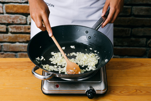 Die Zwiebeln in einer großen Pfanne mit 1EL Olivenöl bei mittlerer Hitze 1–2Min. farblos anschwitzen.