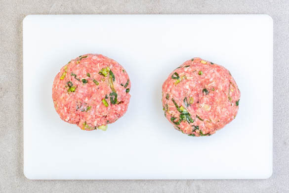 Die Lauchzwiebel in feine Ringe schneiden und mit dem Hackfleisch, 1TL Ketchup sowie je 1 Prise Salz und Pfeffer gut verkneten. Aus der Masse 2 flache Pattys formen, in der Mitte etwas eindrücken.