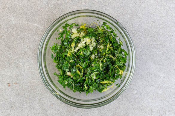 Die ½ der Petersilie samt Stängeln fein hacken. Den Knoblauch schälen und sehr fein würfeln oder durch eine Knoblauchpresse drücken. Die Zitronenschale fein abreiben und mit der Petersilie, dem Knoblauch und 2EL Olivenöl mischen, mit Salz und Pfeffer abschmecken. Die abgeriebene Zitrone in Spalten schneiden.