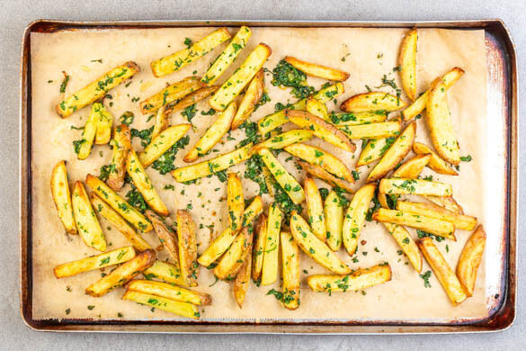 Den Backofen auf 240°C (220°C Umluft) vorheizen. Die Kartoffeln samt Schale in 1–2cm dünne, pommesartige Stifte schneiden, mit 1EL Olivenöl vermengen, auf einem mit Backpapier ausgelegten Backblech verteilen und im Ofen 20–25Min. goldbraun rösten.