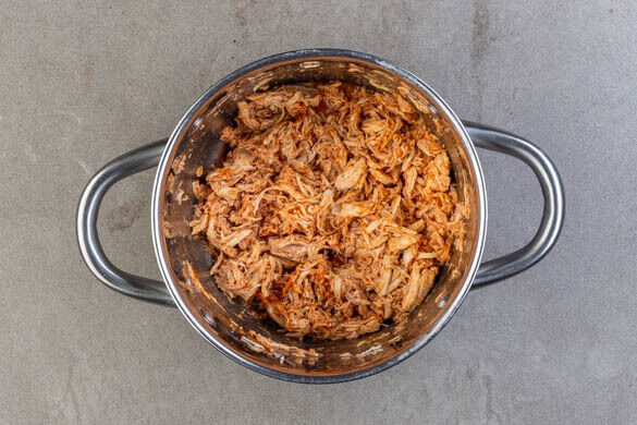Das Pulled Chicken mit der ½ der Gewürzmischung, 1–2EL Wasser und 2TL Essig in einem kleinen Topf ohne Öl bei niedriger bis mittlerer Hitze in ca. 5Min. durchwärmen.