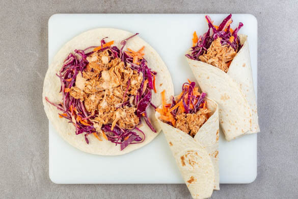 Die Tortillas gleichmäßig mit dem Slaw und dem Pulled Chicken belegen, mit der Sauce beträufeln und zu Wraps aufrollen.