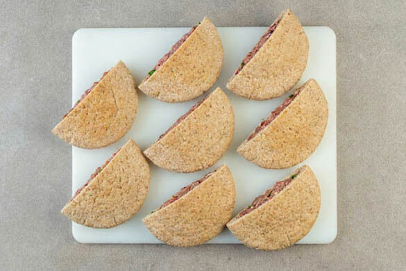 Die Pitabrote halbieren und jede Hälfte auf- aber nicht durchschneiden. Mit einem Esslöffel vorsichtig jede Pitahälfte gleichmäßig mit der Hackfleischmasse füllen, dabei das Hack sachte in die Pitataschen drücken. Langsam arbeiten, damit die Pitabrote nicht zerbrechen.
