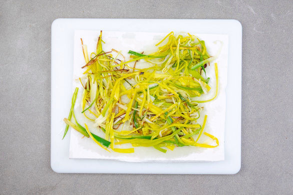 In einer mittelgroßen Pfanne 5EL Pflanzenöl stark erhitzen und die ½ des Lauchs im heißen Öl in 1–2Min. knusprig frittieren. Den Lauch mit einer Schaumkelle aus dem Öl nehmen und auf Küchenkrepp abtropfen lassen. Den Vorgang mit dem restlichen Lauch wiederholen.