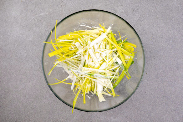 Inzwischen den Lauch einmal quer halbieren, dann die beiden Lauchstücke längs halbieren. Den Lauch in lange, möglichst dünne Streifen schneiden, in einer Schüssel mit 1 kräftigen Prise Salz würzen und ca. 4Min. ziehen lassen. Dann ½EL Mehl untermengen.