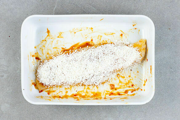 Die Sweet-Chili-Sauce mit der Tandoori-Gewürzmischung und 1½EL Pflanzenöl zu einer Würzpaste verrühren. Den Fisch mit kaltem Wasser abspülen, trocken tupfen und evtl. vorhandene Gräten mit einer Pinzette entfernen. Den Fisch rundum mit der Würzpaste einreiben und in eine große Auflaufform geben. Die Kokosraspel auf dem Fisch verteilen und leicht andrücken.