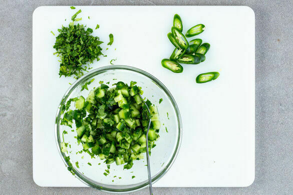 Die Gurken in kleine Würfel schneiden. Den Koriander samt Stängeln fein schneiden und die Peperoni in feine Ringe schneiden. Tipp: Für weniger Schärfe die Kerne entfernen. Die Gurken mit ¼ der Peperoni, der ½ des Korianders sowie 1–2TL Limettensaft und 1 Prise Salz zu einer Salsa vermengen. Nach Belieben mit mehr Limettensaft und Salz abschmecken.