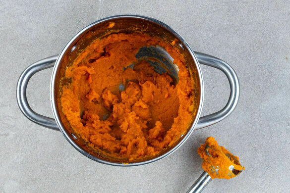 Die Süßkartoffeln und die Karotten in das kochende Wasser geben und in 12–15Min. weich kochen. Mit einer Tasse etwas Kochwasser abschöpfen, dann das Gemüse in ein Sieb abgießen. Zurück in den Topf geben und warm halten.