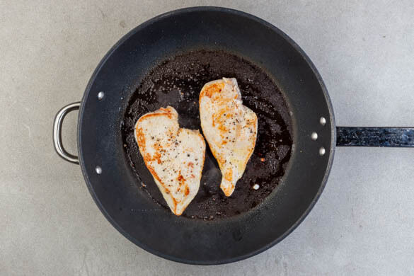 Das Fleisch trocken tupfen und von beiden Seiten mit je 1 Prise Salz und Pfeffer würzen. Das Fleisch in einer großen Pfanne mit 2EL Olivenöl bei mittlerer bis starker Hitze auf jeder Seite 3–4Min. anbraten. Den Herd ausschalten und die Pfanne abgedeckt auf dem Herd stehen lassen.