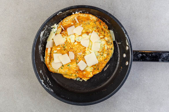 ½EL Butter in einer kleinen Pfanne bei mittlerer Hitze erwärmen. Die Hitze reduzieren, ¼ der Eimasse hineingeben und verteilen. Das Omelett ohne Rühren ca. 3Min. braten, dann vorsichtig wenden und in 2–3Min. goldbraun und gar braten. ¼ des Käses auf dem Omelett verteilen und schmelzen lassen. Aus der Pfanne nehmen und die Schritte mit der übrigen Eimasse dreimal wiederholen.