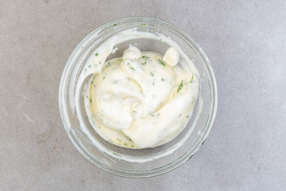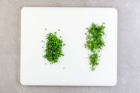 Die Dillspitzen von den Stängeln zupfen und fein schneiden. Den Schnittlauch in kleine Röllchen schneiden.