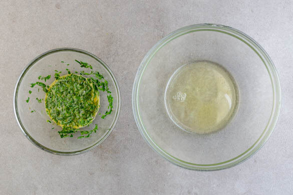 Die Eier vorsichtig aufschlagen und trennen, dabei erst das Eiweiß in eine Schüssel gleiten lassen, während das Eigelb in der Schalenhälfte bleibt. Dann das Eigelb in eine weitere Schüssel geben. Die Eigelbe mit 2EL Milch, den Kräutern und je 1 Prise Salz und Pfeffer verrühren. Die Eiweiße mit 1 Prise Zucker und ¼TL hellem Essig verrühren.