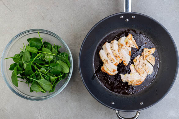Das Fleisch trocken tupfen und von beiden Seiten mit je 1 Prise Salz und Pfeffer würzen. Das Fleisch in einer mittelgroßen Pfanne mit 1EL Olivenöl bei mittlerer bis starker Hitze auf jeder Seite 3–4Min. anbraten. Den Herd ausschalten und die Pfanne abgedeckt auf dem Herd stehen lassen.