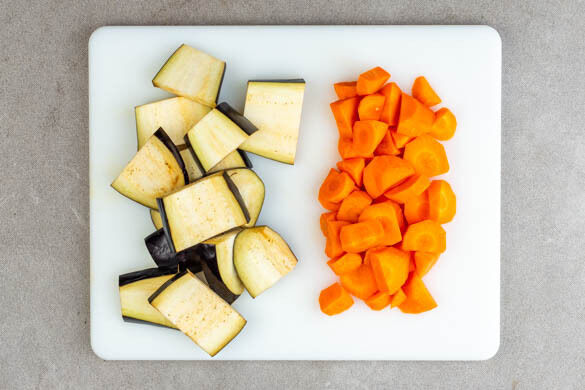 Die Aubergine längs in ca. 1cm breite Scheiben schneiden, dann dritteln. Die Auberginenscheiben mit insgesamt 1EL Pflanzenöl und 1 Prise Salz einreiben. Die Karotte ggf. schälen und schräg in mundgerechte Stücke schneiden. Dazu Schnitte mit einem Winkel von 45° ausführen und die Karotten nach jedem Schnitt um 90° auf sich zu drehen.
