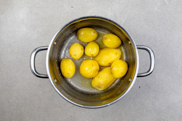 Den Backofen auf 75°C Umluft vorheizen. In einem mittelgroßen Topf ausreichend gesalzenes Wasser für die Kartoffeln zum Kochen bringen. Die Kartoffeln schälen, größere Kartoffeln halbieren. Die Kartoffeln, in das kochende Wasser geben und in 15–20Min. gar kochen. In ein Sieb abgießen und abkühlen lassen.