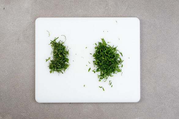 Den Backofen auf 240°C (220°C Umluft) vorheizen. 750g Kartoffeln samt Schale in ca. 2cm große Würfel schneiden. Die Rote Bete schälen und in ca. 1,5cm große Würfel schneiden. Tipp: Da Rote Bete stark färbt, beim Verarbeiten am besten Küchenhandschuhe und Schürze tragen.