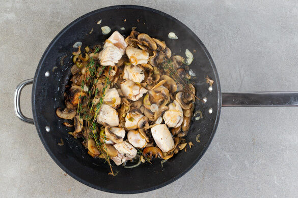 Sobald die Pilze leicht gebräunt sind, das Fleisch, die grob gehackten Oliven, den Knoblauch und den Thymian mit 1 Prise Salz dazugeben und ca. 2Min. mitbraten. Mit den gehackten Tomaten ablöschen, 1/2TL Zucker und 1 Prise Salz unterrühren und die Sauce abgedeckt auf der niedrigsten Stufe 4–5Min. sanft köcheln lassen.